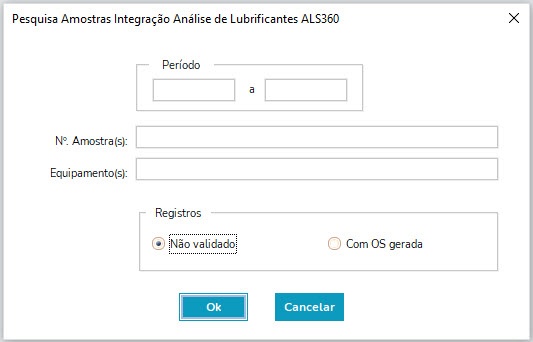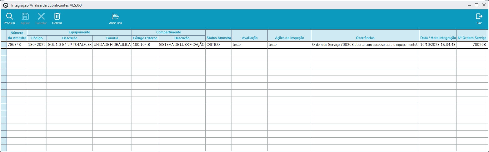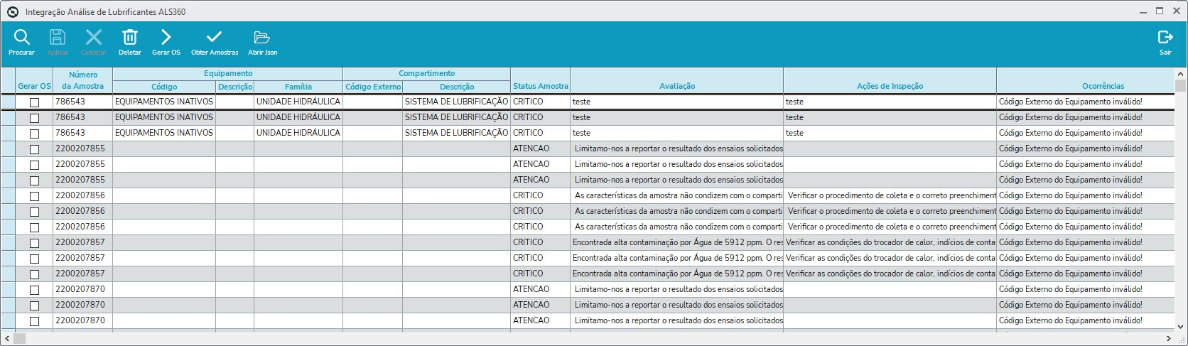 Objetivo: Demonstar os registros gerados a partir da integração das Amostras de Análise de Lubrificantes obtidas na integração com o sistema ALS360.