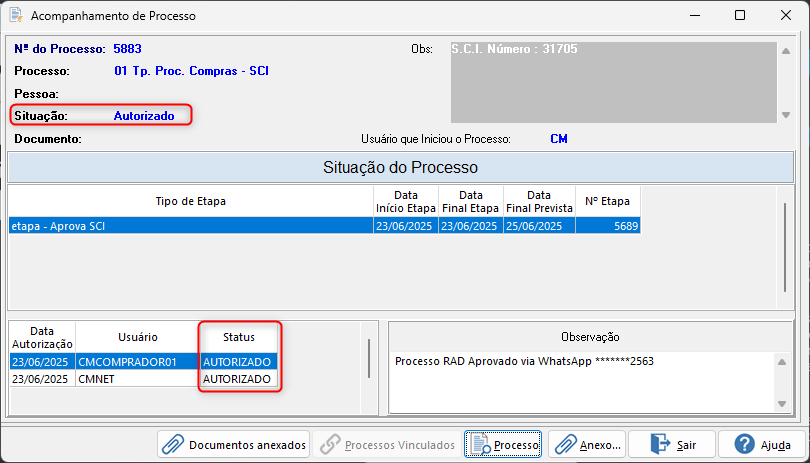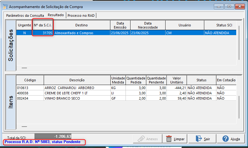 Abaixo a tela de Consulta - Acompanhamento de Solicitação de Compra, onde pode ser verificado o Status do Processo RAD.