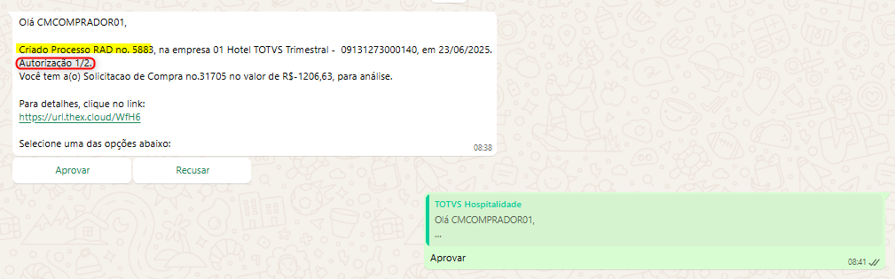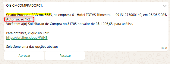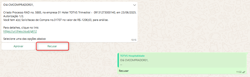 Ao clicar em APROVAR ou REPROVAR no WhatsApp é iniciada a comunicação com o Plugin Robot, pois é ele quem faz o retorno da opção indica ao sistema.