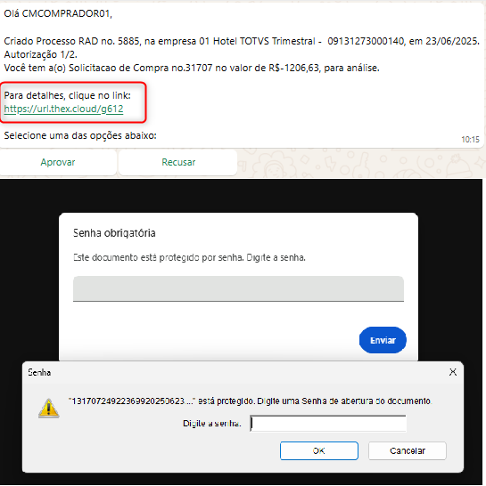 Observação: O link enviado na mensagem do WhatsApp contém o documento com a descrição detalhada da solicitação, após clicar no link você precisará baixar o arquivo e ao abrir deverá inserir uma senha que corresponde aos 4(quatro) primeiros dígitos do CPNJ da empresa.
