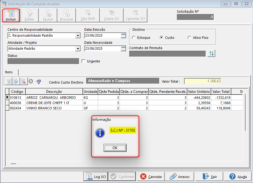 Acesse o módulo Compras: (1) Clique em "Compras". (2) Solicitação de Compra" (3) "Avulsa" (4)"Incluir", para criar uma "Solicitação de Compras" conforme a necessidade (5) Clique em "Confirmar".
