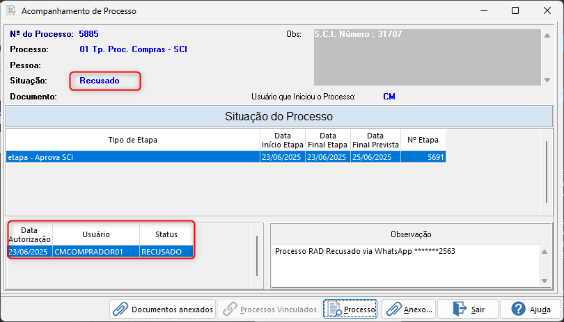 Após "Recusar", será possível acessar a tela Consultas - Processo no RAD:
