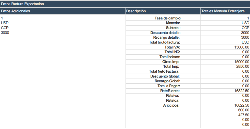 - Validar que en el formato PDF, los montos se muestren en moneda COP, y que se visualice la información en la moneda origen del Documento.