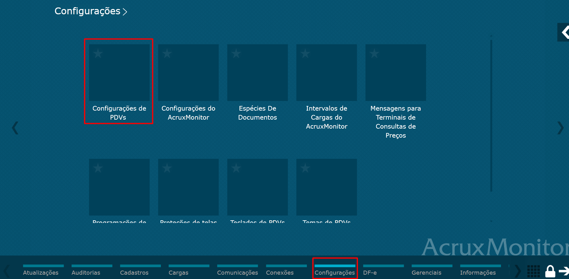 Ao acessar o Monitor vá em Configurações, depois Configurações de PDVs.