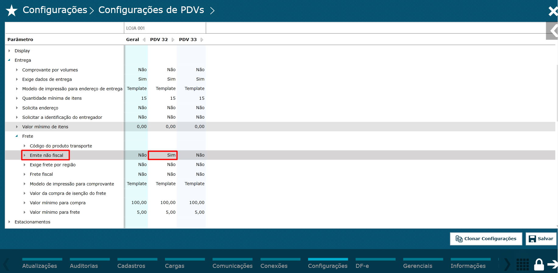 Imagem 2 - Configuração do frete não fiscal.