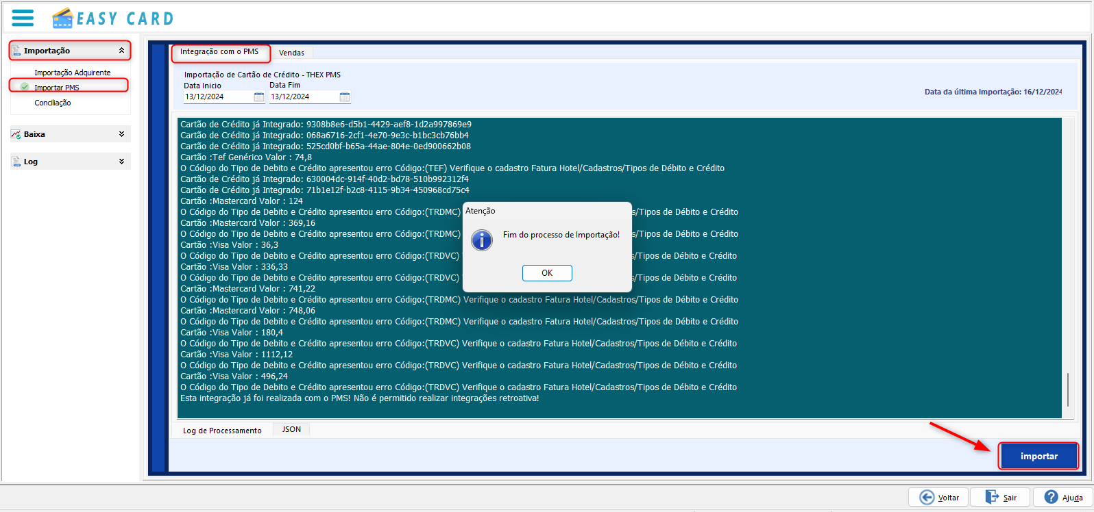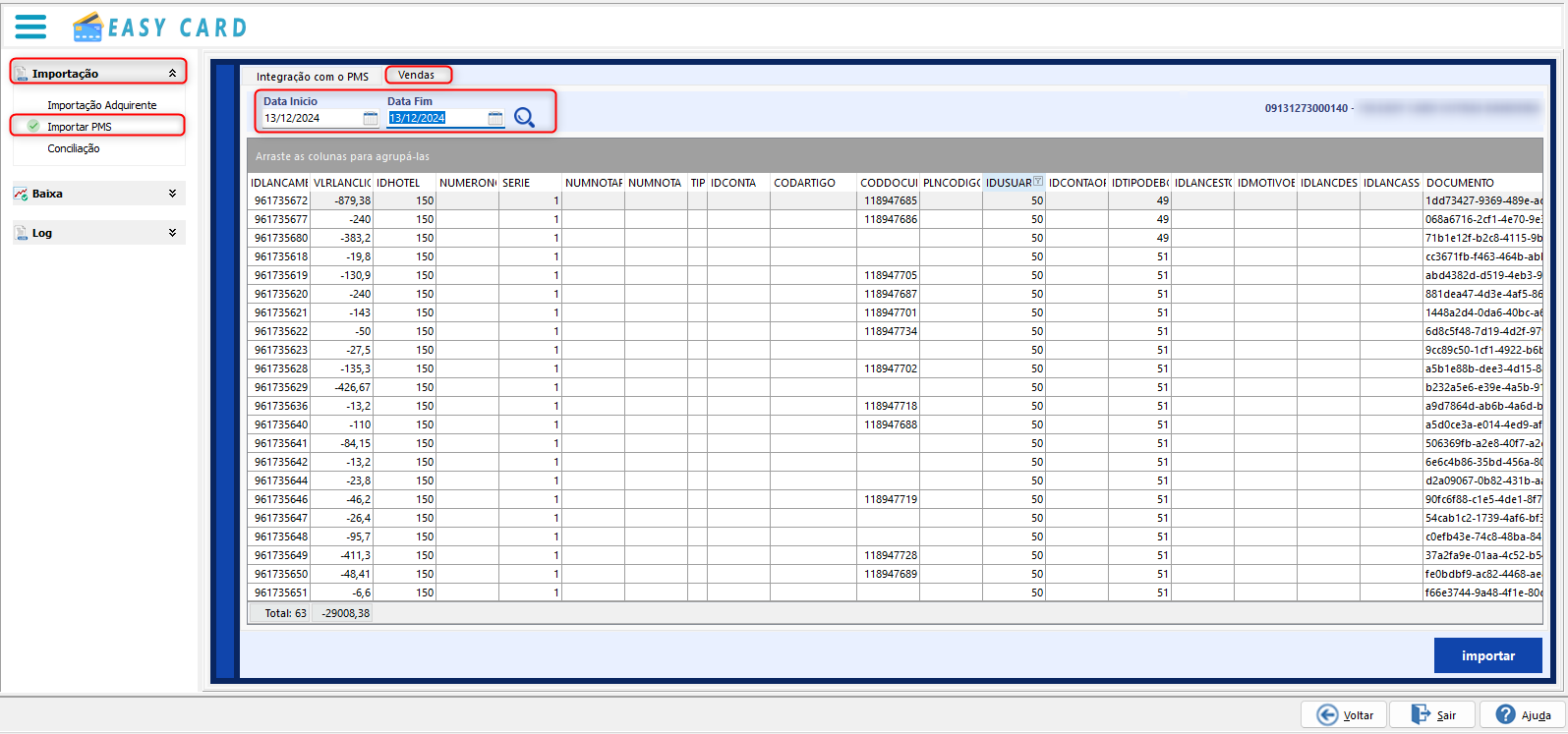 Nessa é realizada a importação manual dos registros de venda do PMS para o Plugin do conciliador EasyCard.