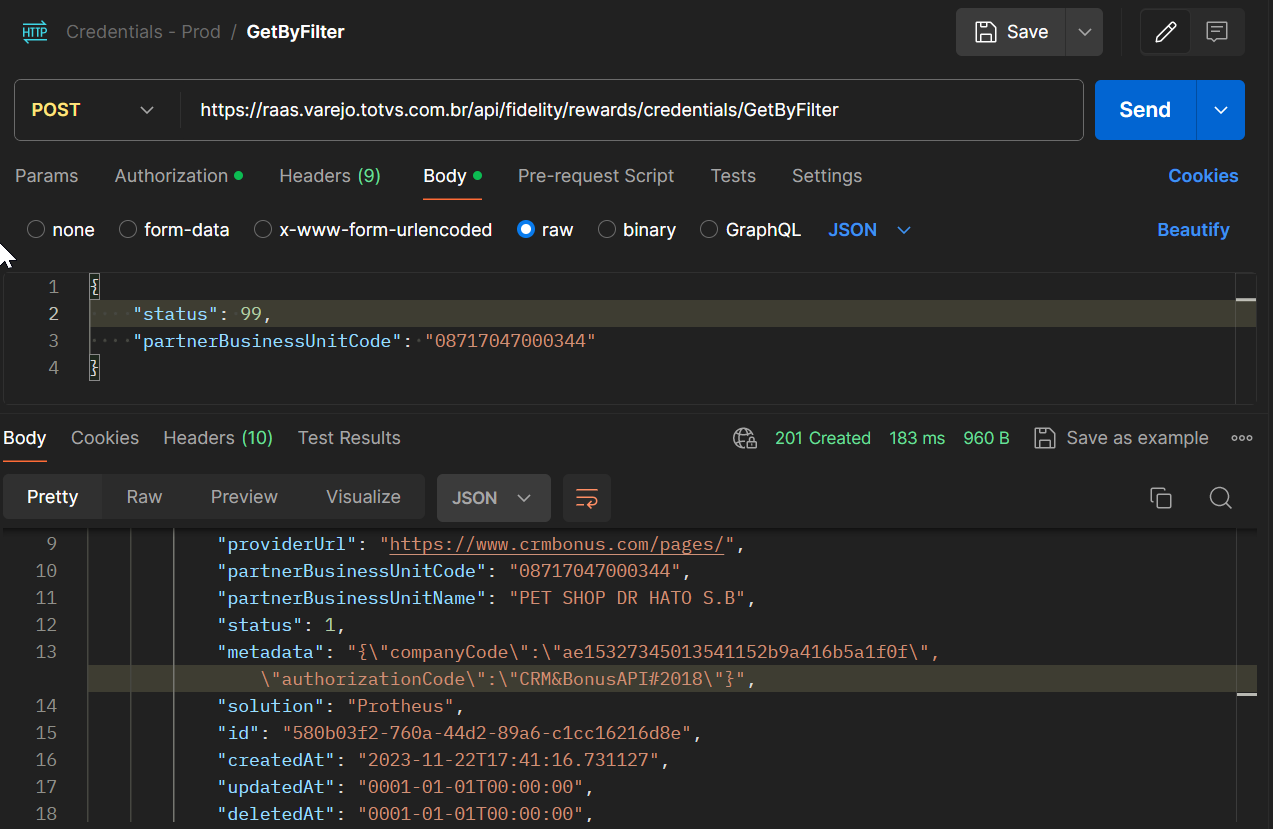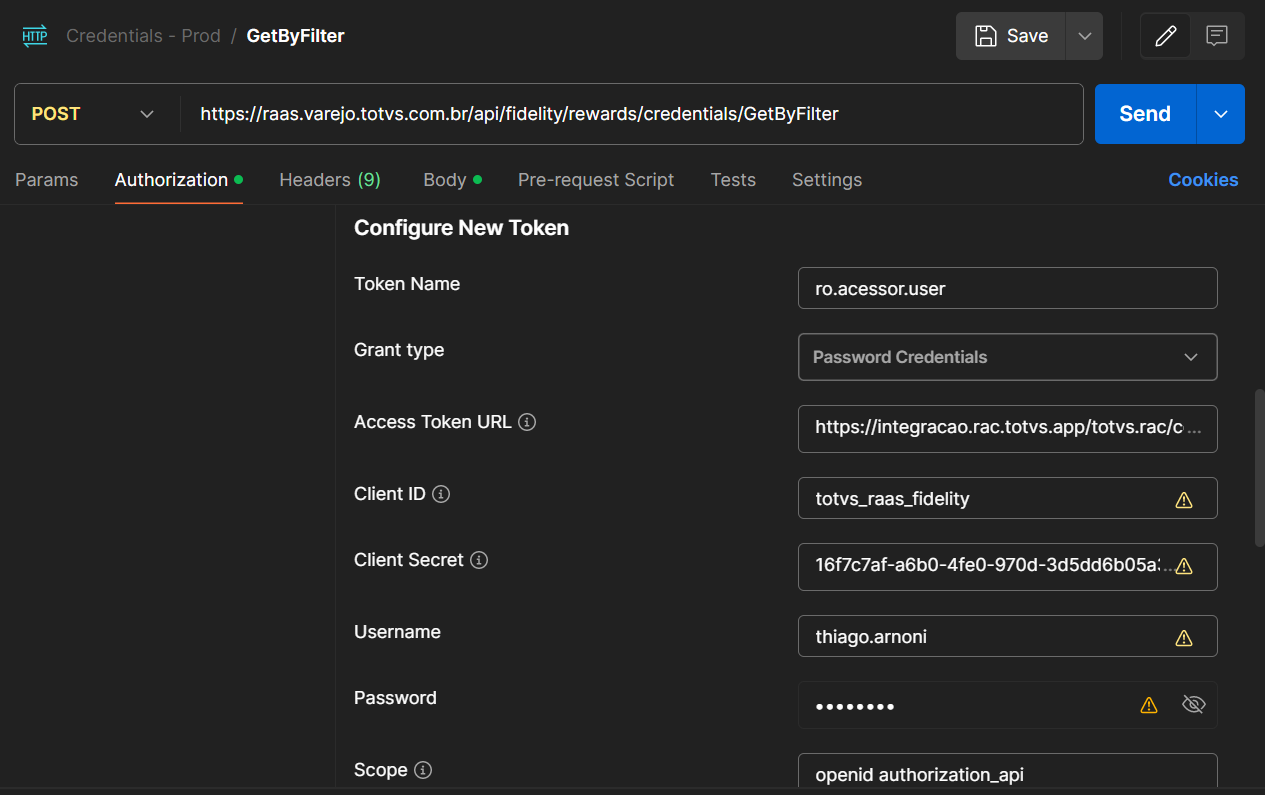 Essa validação pode ser feita através da ferramenta Postman. Basta executar a API de consulta ((POST) https://raas.varejo.totvs.com.br/api/fidelity/rewards/credentials/GetByFilter).