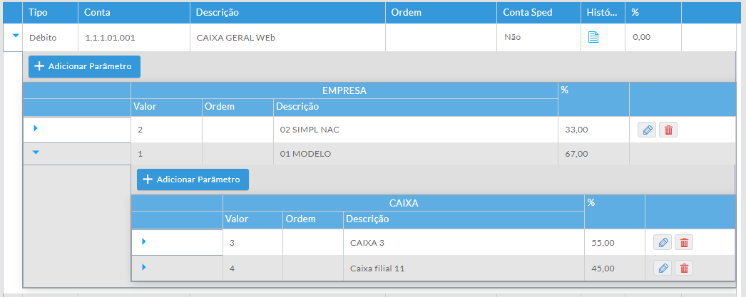 | porcentagem | Valor da porcentagem de rateio do parâmetro | Não | Numérico | - |