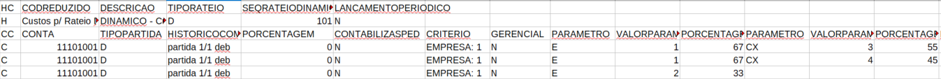 | CC | CONTA | TIPOPARTIDA | HISTORICOCOMPLETO | PORCENTAGEM | CONTABILIZASPED | CRITERIO | GERENCIAL | PARAMETRO | VALORPARAMETRO | PORCENTAGEMPARAMETRO | PARAMETRO | VALORPARAMETRO | PORCENTAGEMPARAMETRO | PARAMETRO | VALORPARAMETRO | PORCENTAGEMPARAMETRO |