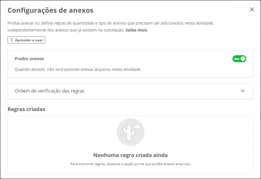 Se nenhuma regra for definida, é permitido adicionar qualquer tipo e qualquer quantidade de anexos, ou seja, nenhuma validação é feita.