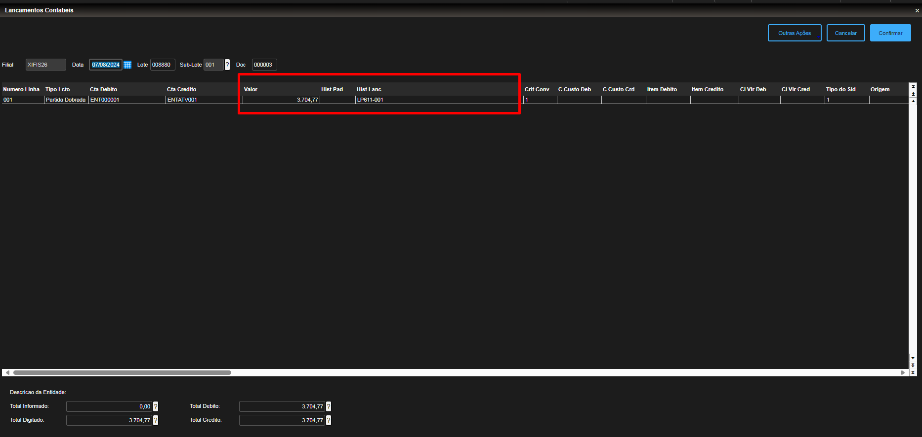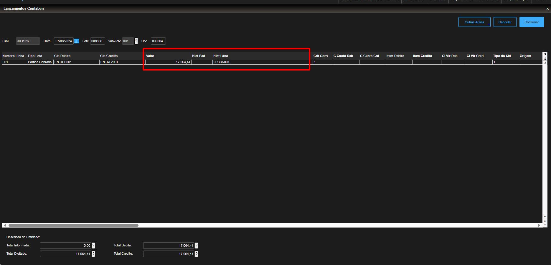 Em caso de reprocessamento autorizado, havendo o LP de estorno configurado corretamente, o sistema executa a contabilização do mesmo: