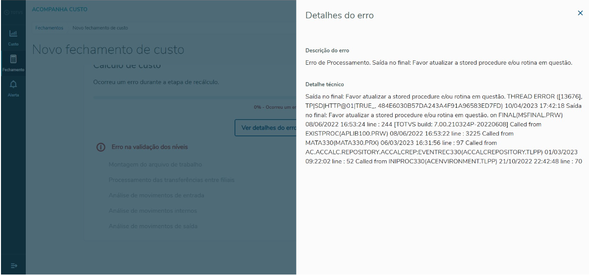 OCORRÊNCIA 21 - Ao clicar na aba de acompanhamento de Custo Kardex apresenta a seguinte mensagem: "Verificamos que há rotinas desatualizadas no seu ambiente. Aplique o último acumulado do módulo de estoque e Custos para acessar a funcionalidade" |