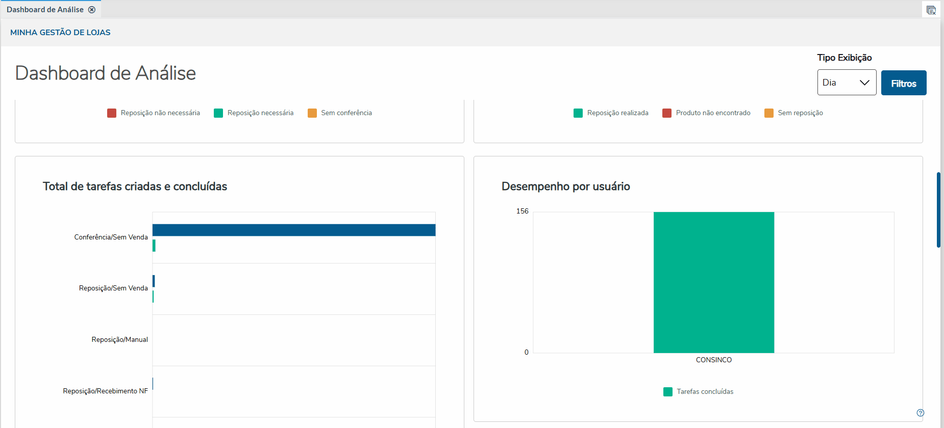 O painel Reposições não Realizadas vai exibir o total de reposições concluídas e que foi informado que não achou o produto para abastecer, e também reposições não concluídas. Junto com o totalizador, será divido como :