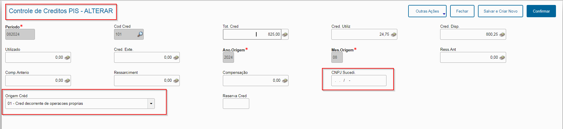 A solicitação foi reenviada na data de expedição dessa issue. Dessa forma, os campos Origem Créd. e CNPJ ainda permanecem desabilitados para edição, e sua correção somente estará disponível para a próxima expedição contínua com data ainda a ser comunicada.