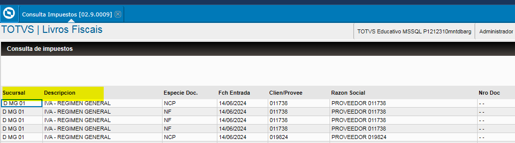 Al ejecutar el sistema en un idioma diferente al portugués y realizar la "consulta de impuestos (FISA025)", el sistema no respeta el idioma seleccionado y muestra las descripciones en portugués, como se muestra en la imagen siguiente.
