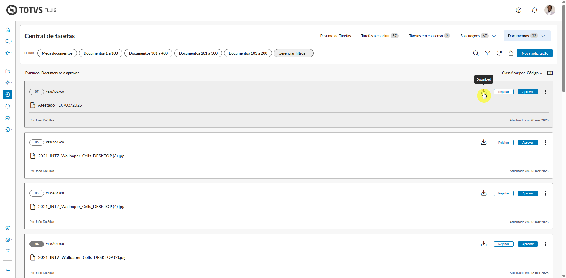 - Em Documentos a aprovar, é possível aprovar ou rejeitar direto pela lista, sem abrir o documento.