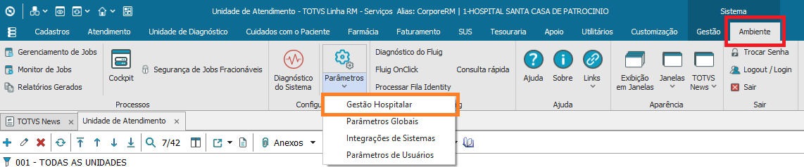 Além de atribuir o layout TOTVS na unidade de atendimento é necessário também realizar a configuração dos endereços de envio e cancelamento. Essa configuração deve se realizada no Ambiente > Parâmetros > Gestão Hospitalar no RM.