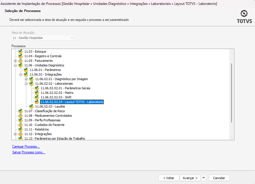 Clique em avançar e será apresentado à lista de processos e suas parametrizações. Dentro da opção Unidade Diagnóstico > Integrações > Laboratoriais > Layout TOTVS - Laboratoriais.