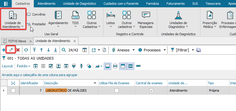 1. Selecionar a unidade de atendimento para realizar a configuração na aba de integrações acessando o caminho Cadastros > Unidade de Atendimento clicar no botão editar do registro.