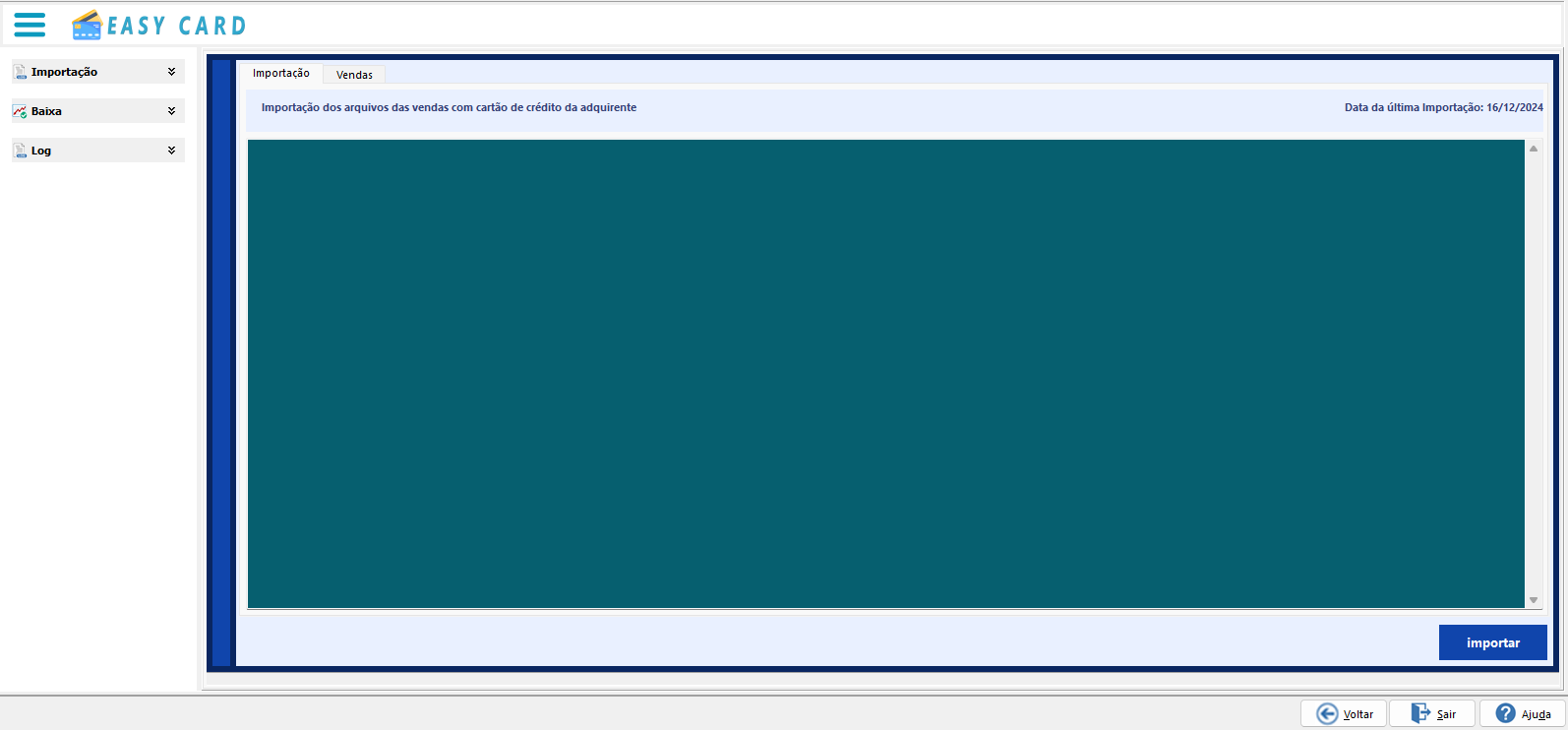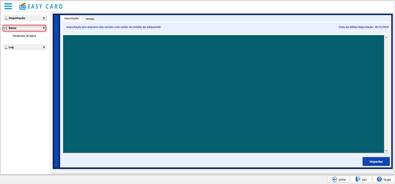No menu Operações, será exibido a tela de inicial com os submenus Importação e Baixa, para que sejam realizadas as importações manuais e/ou consultas das vendas importados da Adquirente e PMS e também a operação de efetivação de baixa para os documentos já integrados com o Contas a Receber.