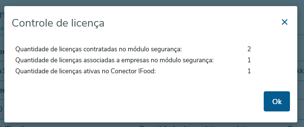 | Quantidade de licenças contratadas no módulo segurança | Total de quantidade de licenças contratadas do Conector IFood que constam no módulo segurança |