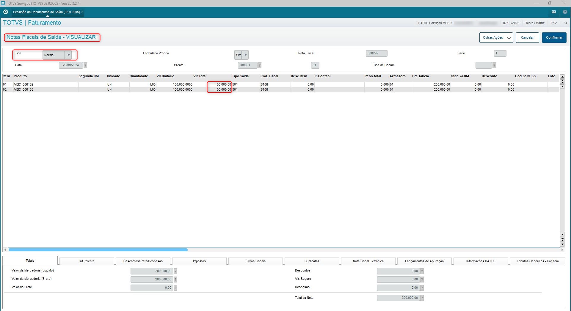 8° Defina o tipo de NF como ( Devolução ) formulário Próprio = Não, e o número da NF informe o conteúdo 777777, série 77 e informe o cliente X, já na linha do item, devolva apenas um produto da ( Primeira NF ) de Saída e finalize a emissão da NF de Devolução.