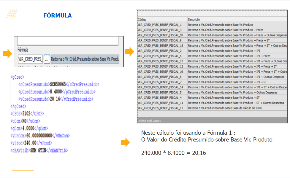 Preencha as opções obrigatórias : Código Beneficio / Figura Tributaria / % ICMS NF / % Credito Presumido e a Formula.