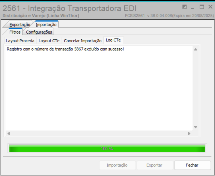 Na importação → Aba → Log CT-e será gerado com a mensagem "Registro com o número de transação xxx excluído com sucesso!"