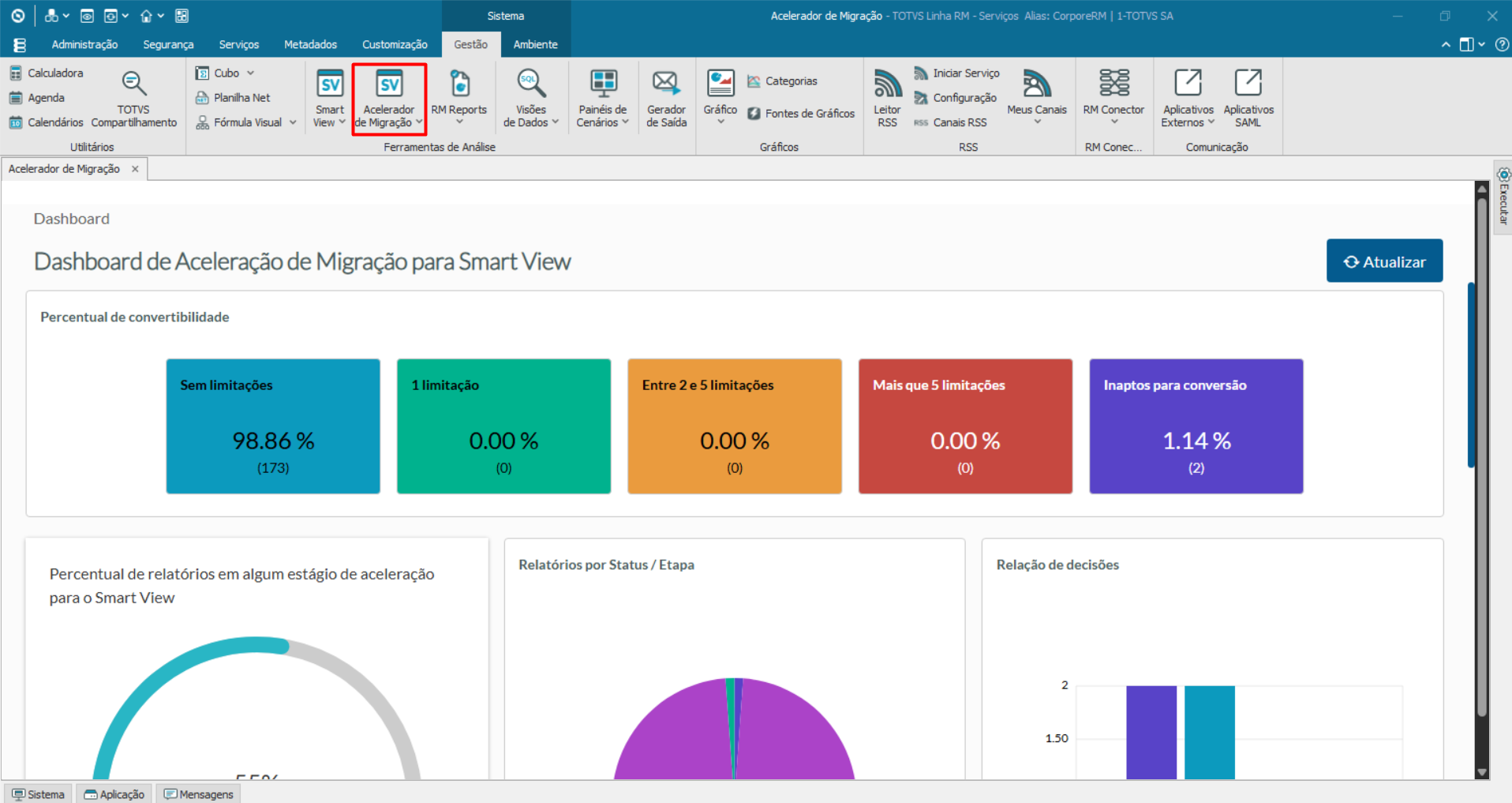 No Dashboard de Aceleração para o Smart View é possível validar por meio de gráficos e análise de dados o status, qualidade e saúde da aceleração do ambiente e relatórios RM Reports para o Smart View. Nesta documentação você encontrará informações acerca de cada um dos gráficos e elementos do Dashboard, o que significam e como utilizá-los.