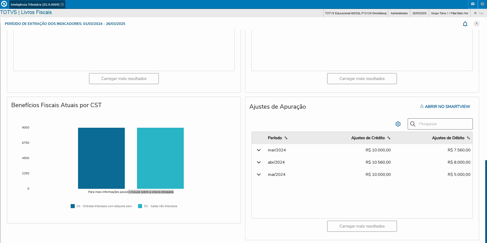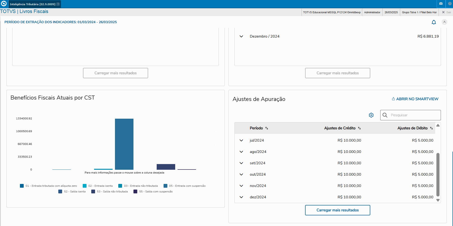 1- Acessar o Módulo 9 "Livros Fiscais" -> Menu Miscelânea -> Totvs Inteligência Tributária -> Aba Reforma Tributária / Card Evolução Tributária Mensal.