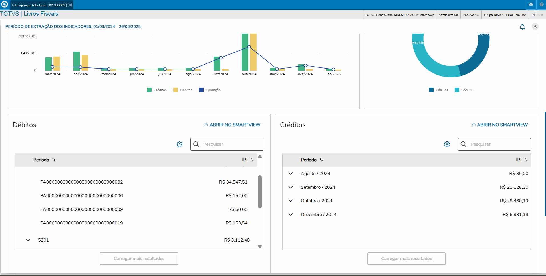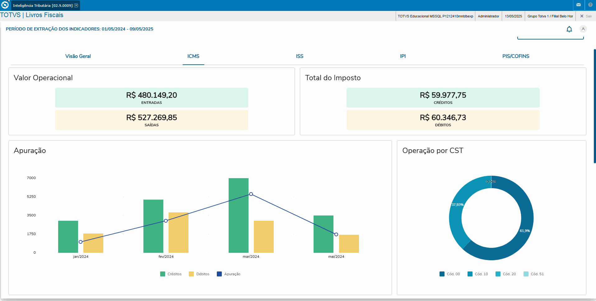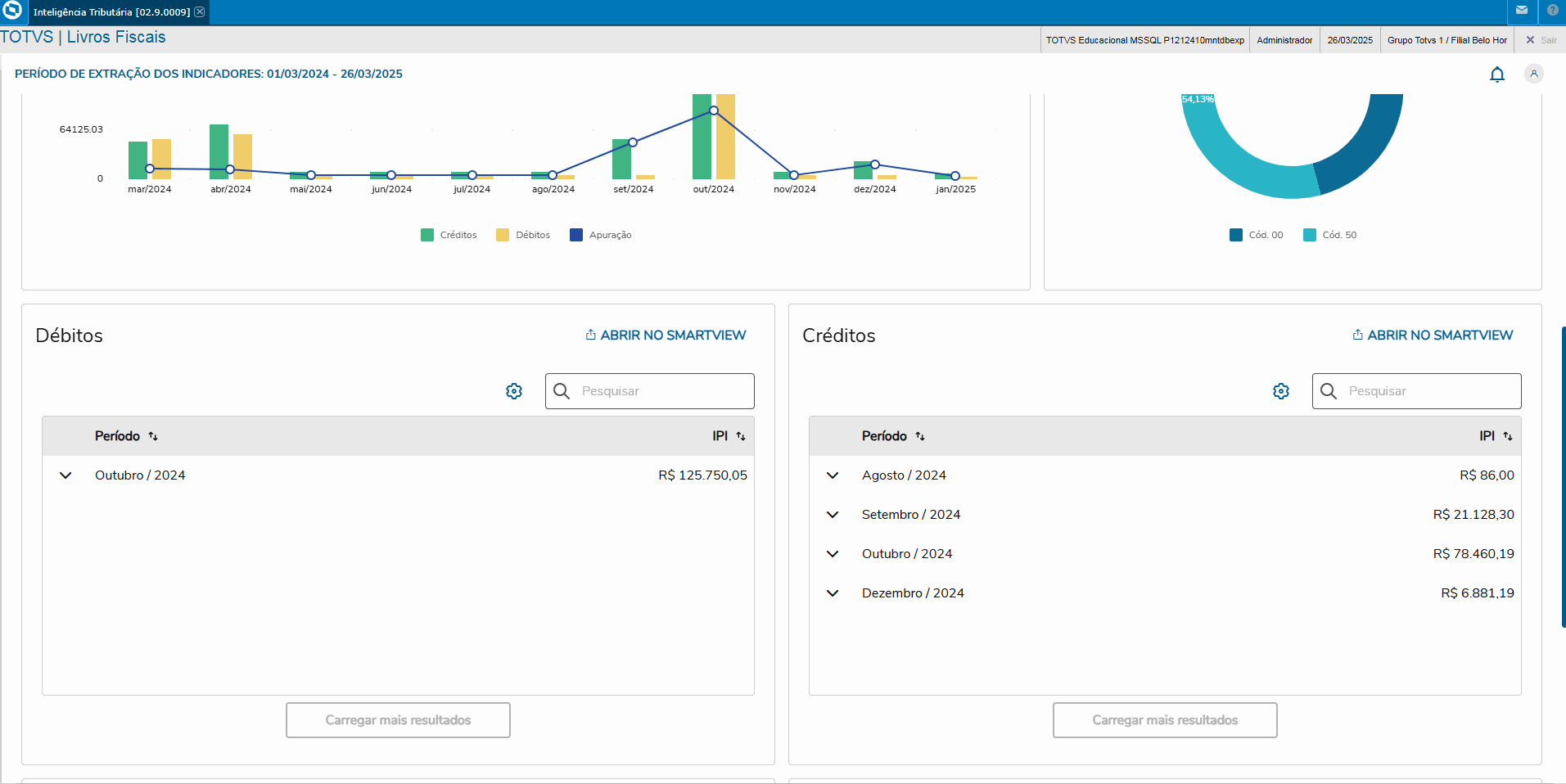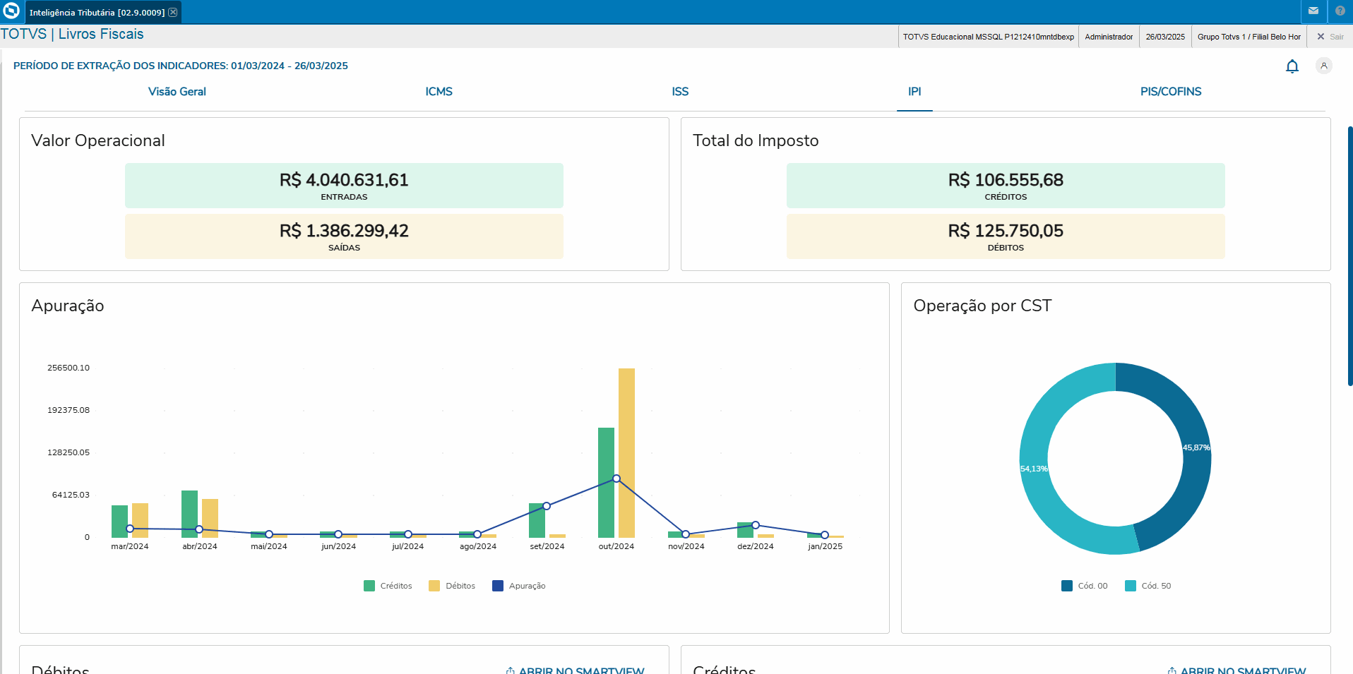 Os valores apresentados no quadro Débitos correspondem aos movimentos em que houve cálculo dos impostos, contemplando todos os códigos de situação tributária, com ou sem débito.