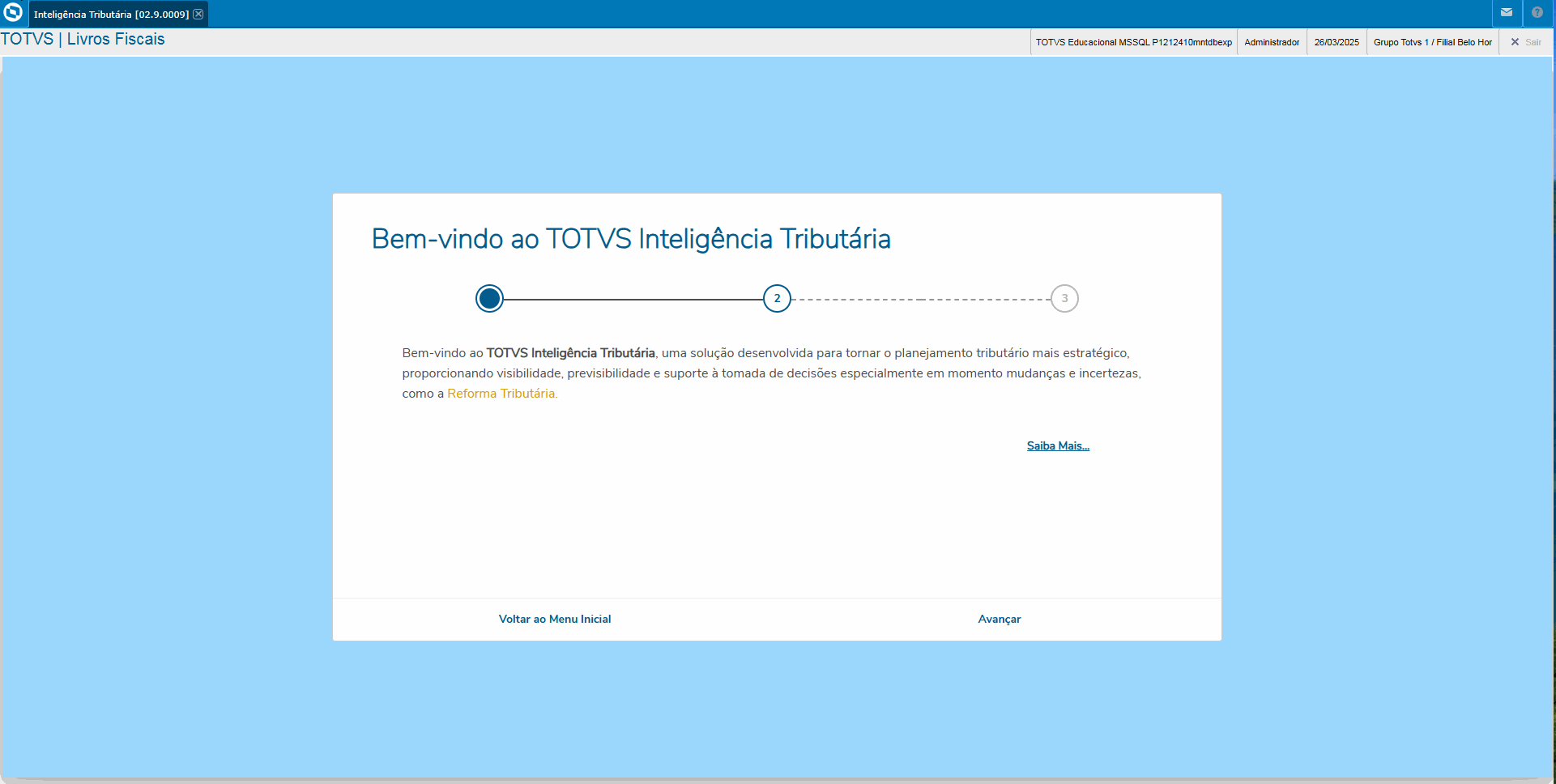 Ao acessar o sistema deverá apresentar a Tela de Boas vindas ao Totvs Inteligência Tributária.