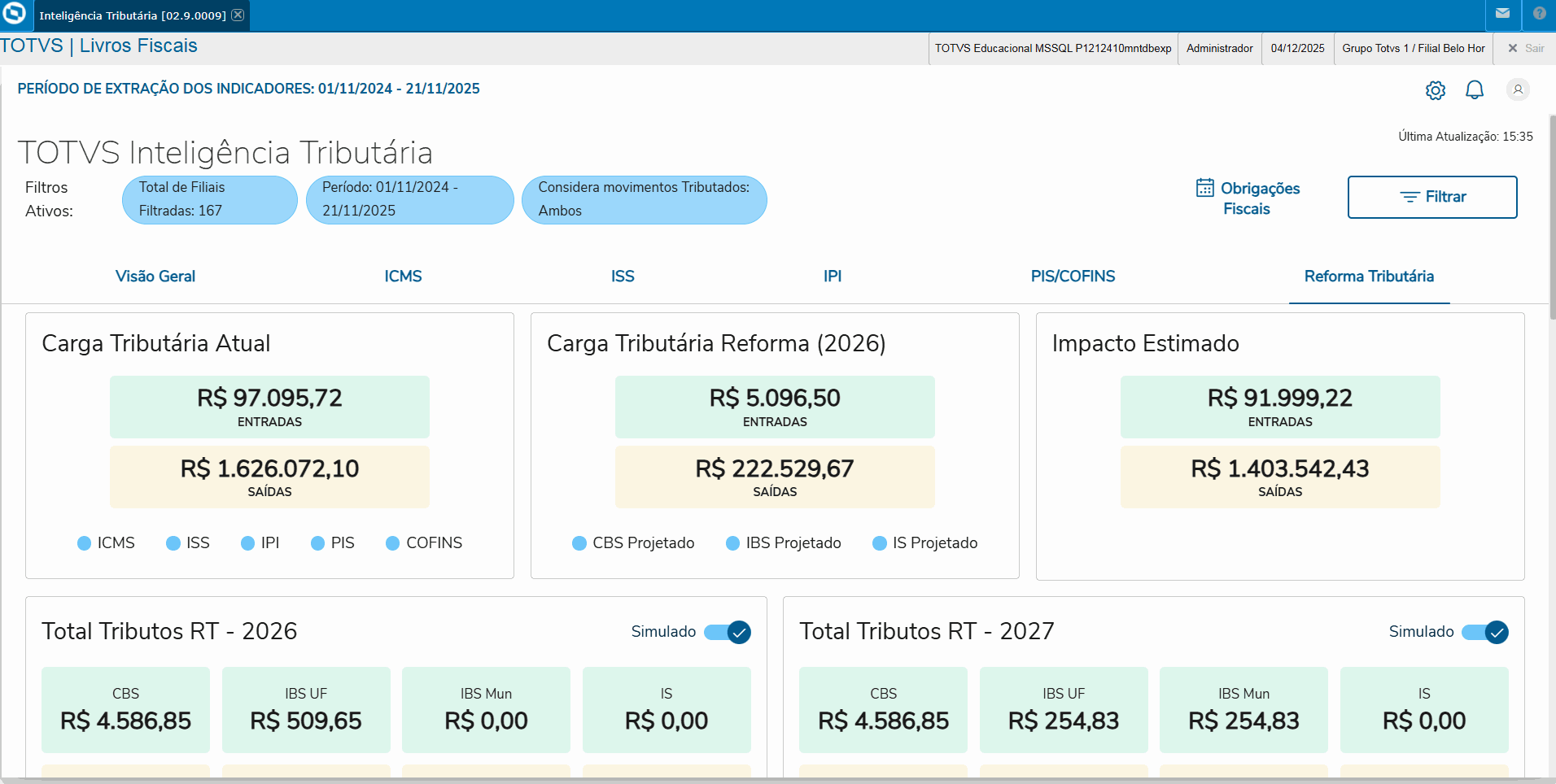 3 - Card Total Tributos RT-2027: Total de Entradas e Saídas conforme a o filtro selecionado de valores Simulados e Reais por Imposto CBS, IBS Federal, IBS Municipal e IS Projetado.