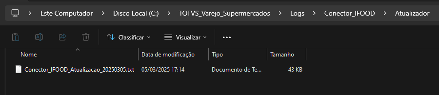 Log do Atualizador: Movido de C:\_ConectorSiteMercado\_Atualizador\Atualizacao_AAAAMMDD.txt para C:\TOTVS_Varejo_Supermercados\Logs\Conector_IFOOD\Atualizador\Conector_IFOOD_Atualizacao_AAAAMMDD.txt