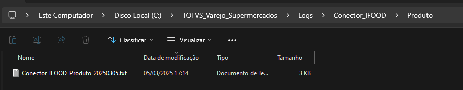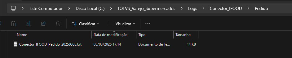 Log de Integração de Pedidos: Movido de C:\TOTVS_Varejo_Supermercados\Logs\Conector_IFOOD\Pedido\Pedido_AAAAMMDD.txt para C:\TOTVS_Varejo_Supermercados\Logs\Conector_IFOOD\Pedido\Conector_IFOOD_Pedido_AAAAMMDD.txt
