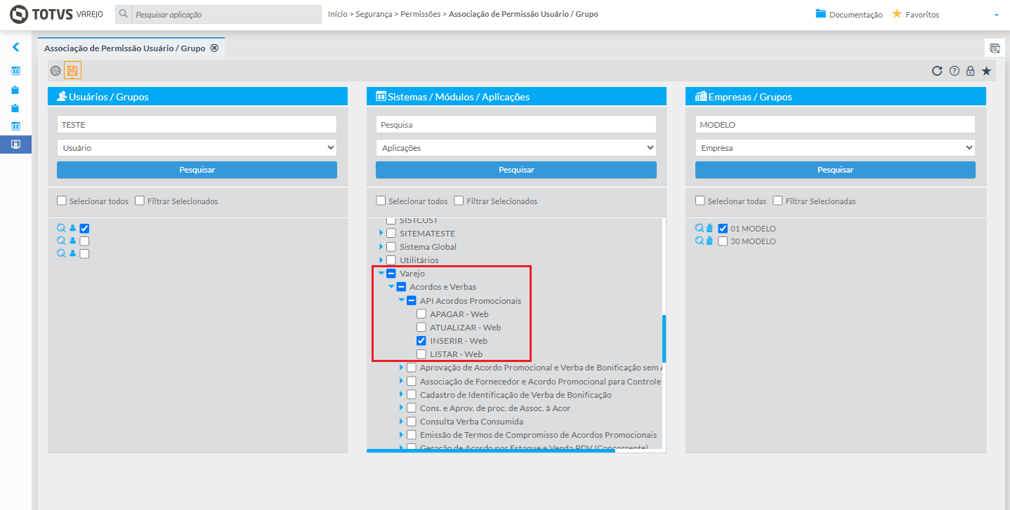 Para isso, acesse o módulo SegurançaWeb > Permissões > Aplicação Associação de Permissão Usuário / Grupo > Sistemas/Módulo/Aplicações > Varejo > Acordos e Verbas > API Acordos Promocionais