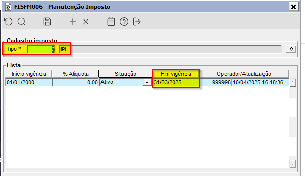 Imagem 01 - Demonstração no FISFM006 de Manutenção de Imposto, com teste no imposto 3 e inclusão da data "Fim vigência = 31/03/2025".