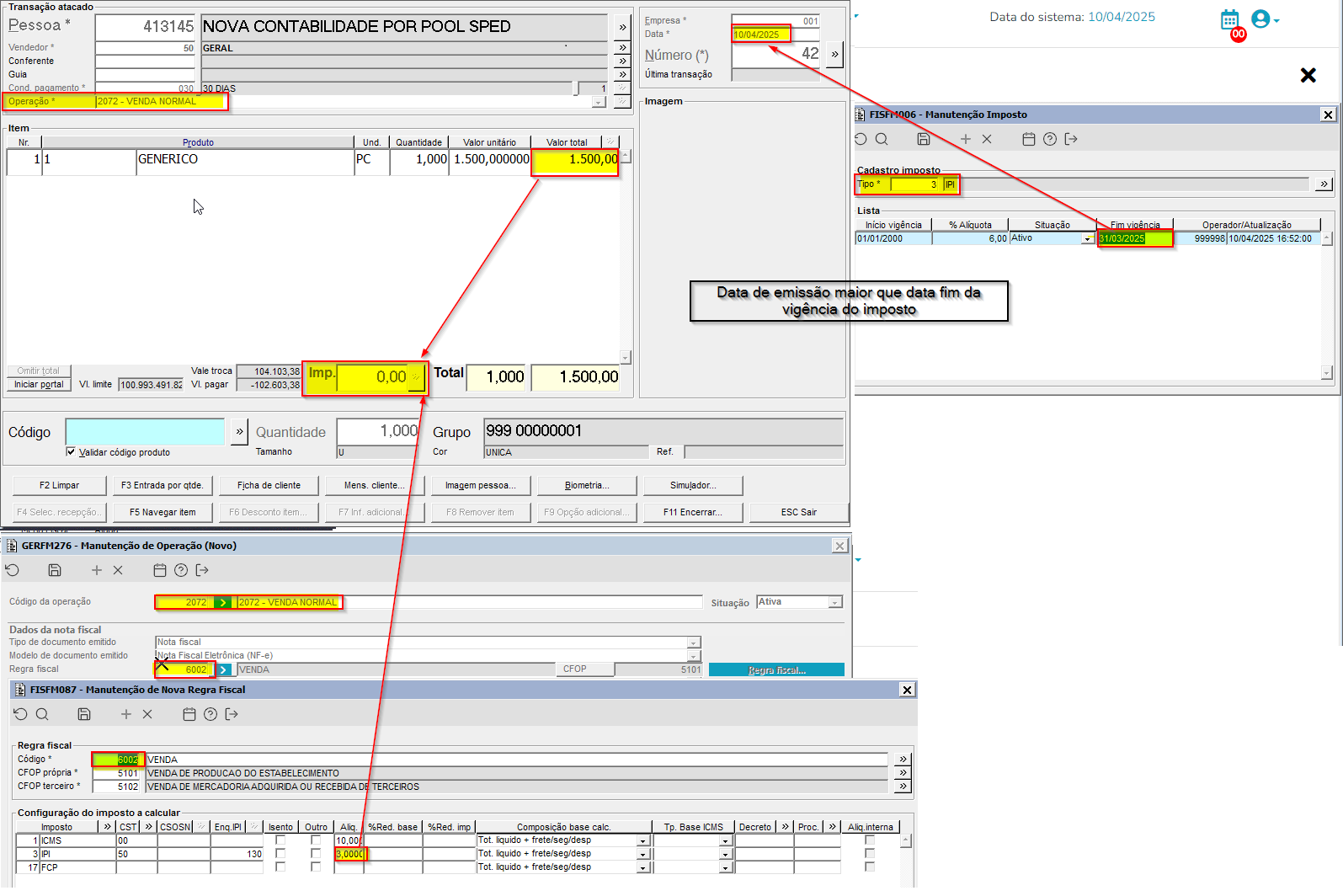 - Se ao emitir a NF, o imposto esteja com a data fim menor que a data de emissão da NF, o sistema não aplicará o calculo do imposto.