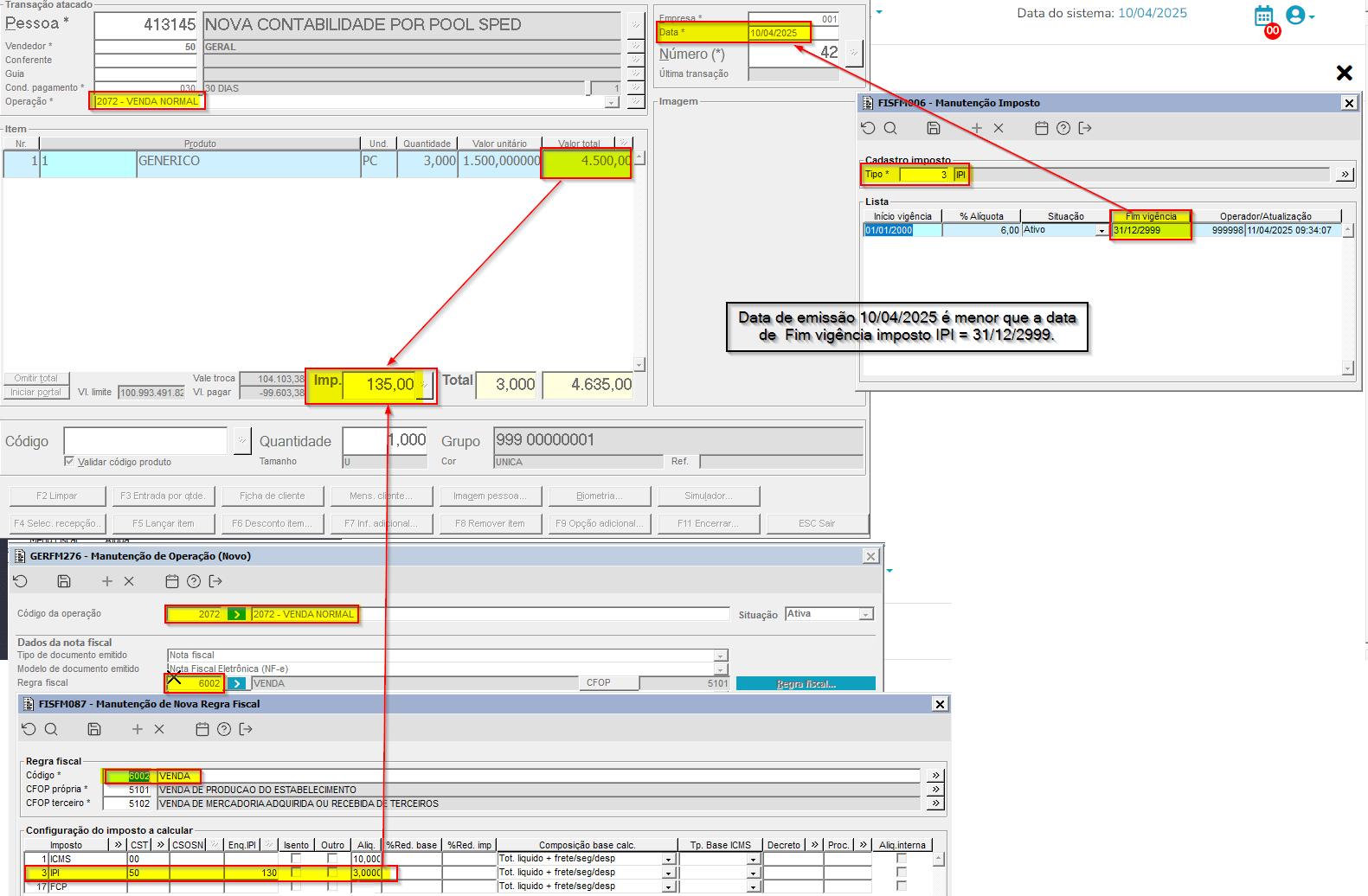 Imagem 04 - Demonstração no TRAFM060 de Lançamento de Transação Completo, utilizando a operação=2072, da regra fiscal=6002 com o imposto IPI=3,00 e com a data final de vigência = 31/12/2999 no FISFM006 e mostrando o valor do imposto = 135,00 (emissão nf = 10/04/2025).