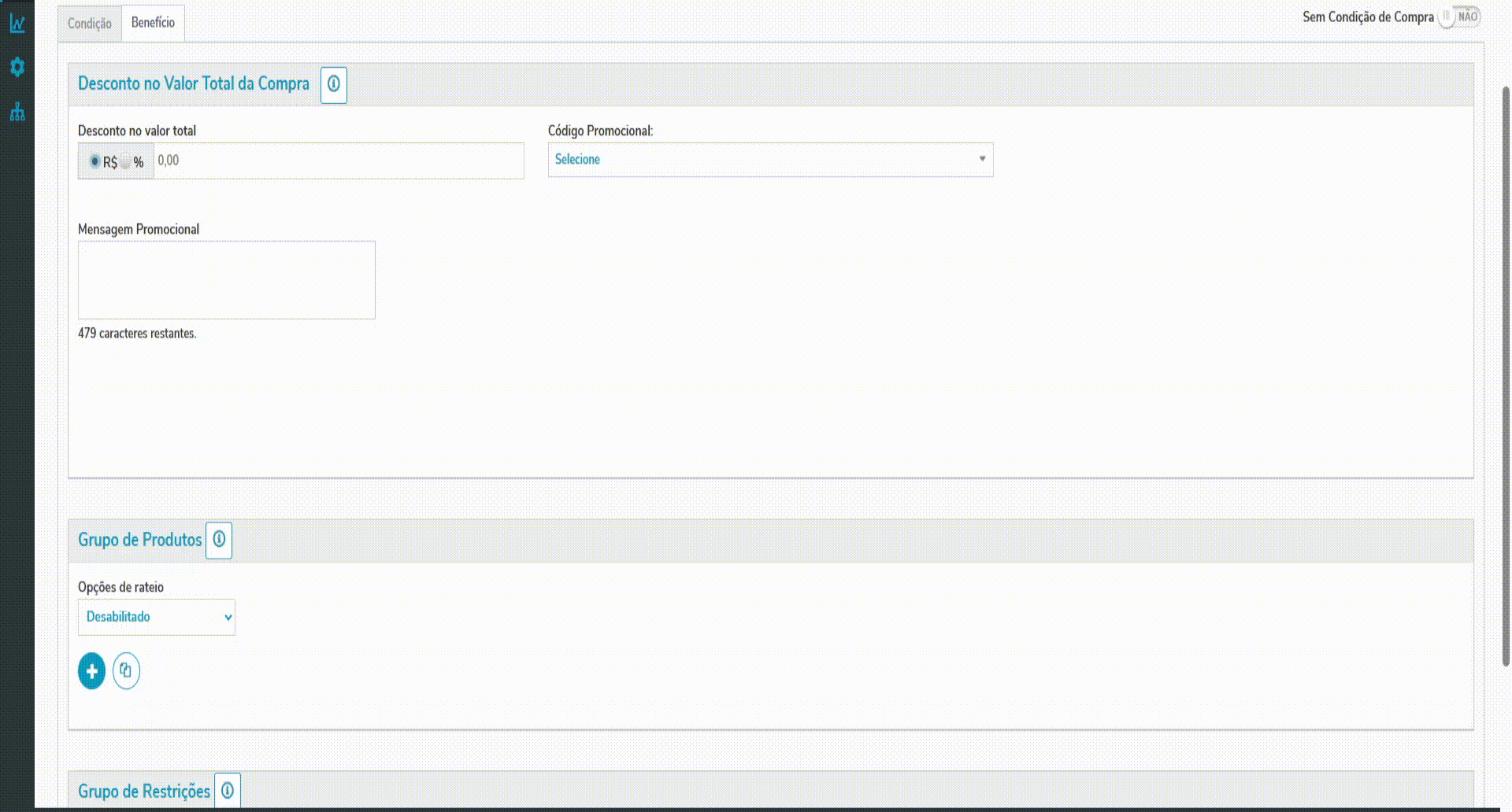 Observação: Ao selecionar uma lista de código promocional no benefício da mecânica, caso não possua mensagem promocional o Motor irá inserir a mensagem padrão configurada em Configurações → Parâmetros de Configuração → Mensagens → MENSAGEM_CODIGO_PROMOCIONAL_BENEFICIO.