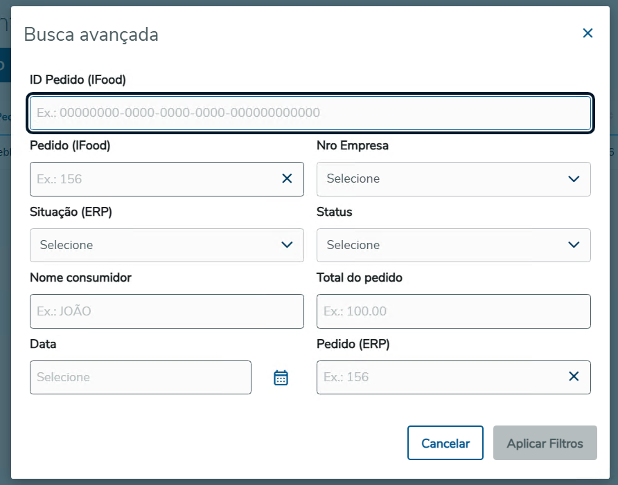 É possível realizar a busca por ID Pedido(iFood), Pedido (iFood), Nro Empresa, Situação (ERP), Status, Nome consumidor, Total do pedido, Data e Pedido(ERP).