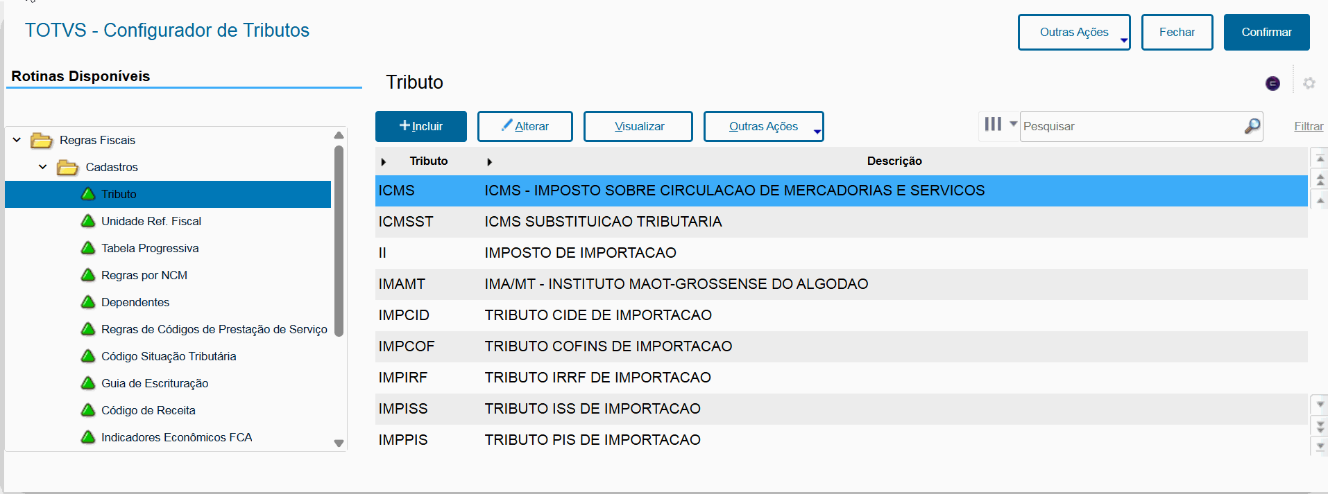 O primeiro cadastro a ser verificado é o cadastro de Tributo. Este cadastro vem com uma carga inicial que contém os tributos que são calculados pelo legado, mas havendo necessidade de incluir algum tributo que não conste na lista, basta cadastrar.