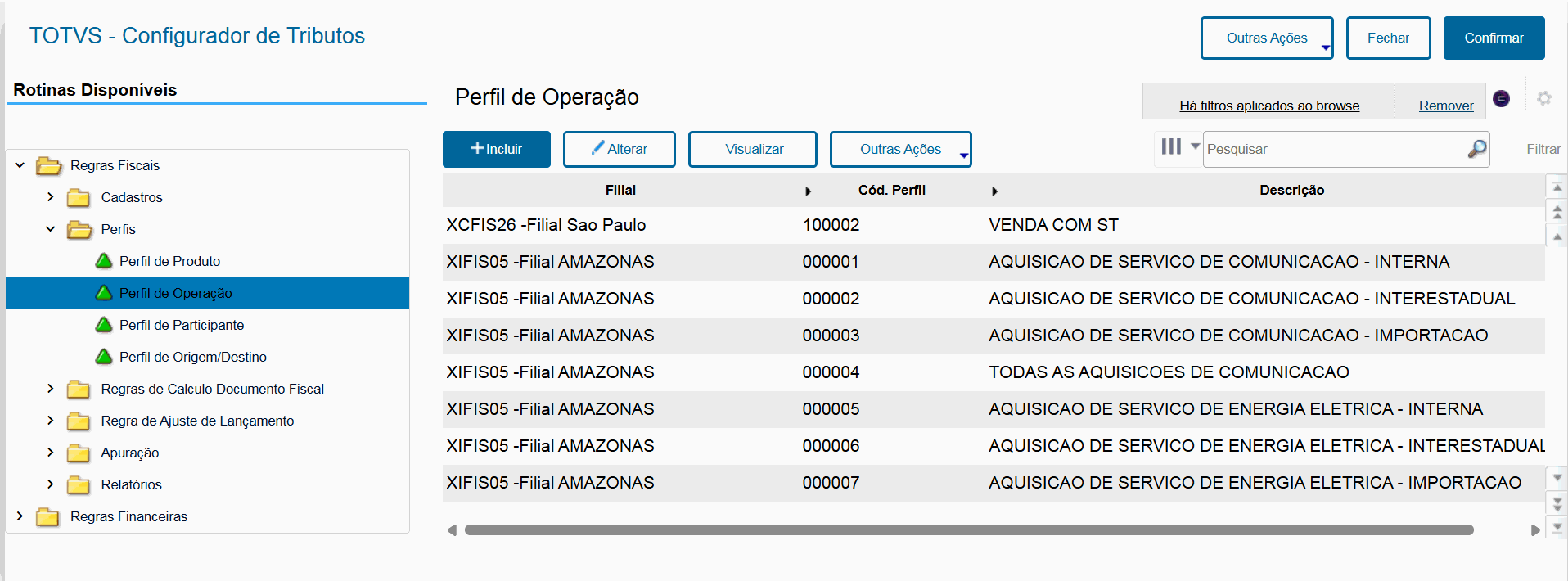 Neste Perfil, é definido as Origens/Destino das operações. Se é uma Saída Interestadual, por exemplo, ou uma Operação Interna.