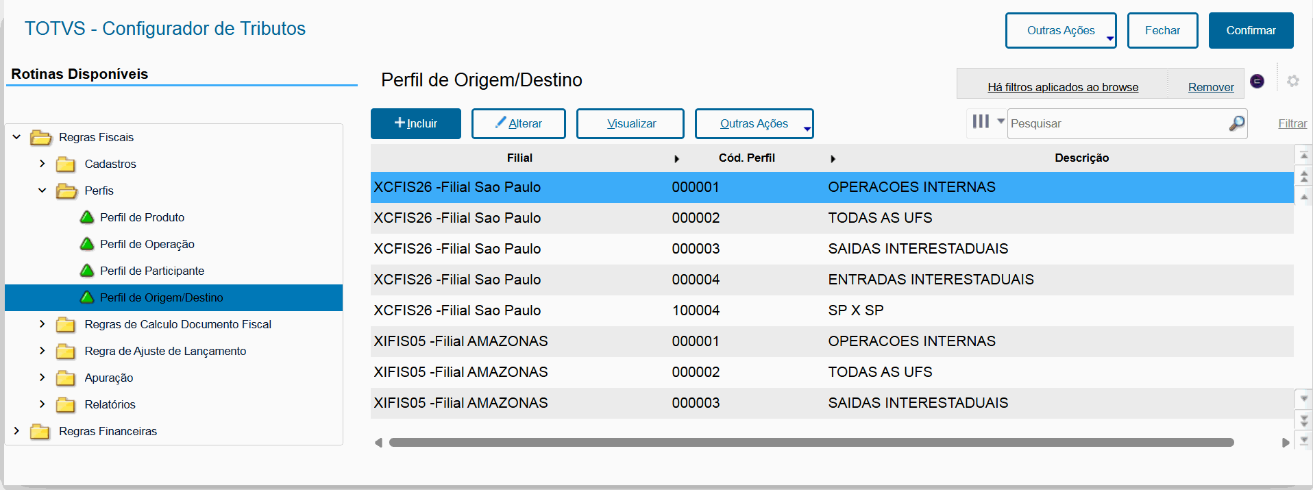 Regras Fiscais > Perfis > Perfil de Origem/Destino