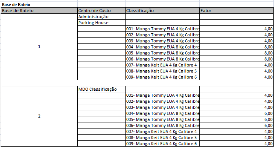Valor Rateado = (Valor a ser rateado do Centro de Custo e Conta / Soma do Produto entre a Produção e o Fator da Base de Rateio) * Produto entre a Produção e o Fator da Base de Rateio.