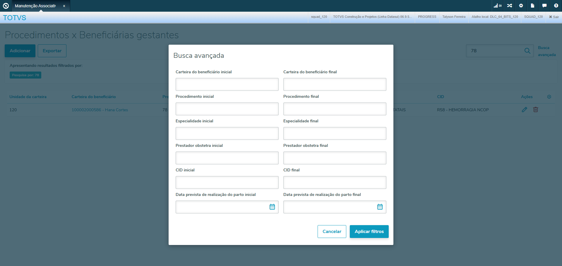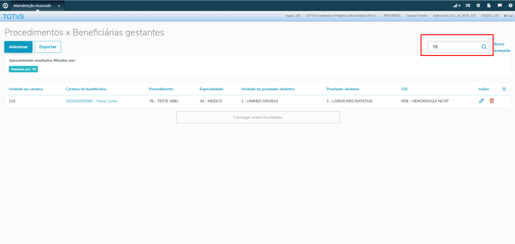 É possível localizar registros informando um dos seguintes parâmetros na caixa de pesquisa: Código Internacional de Doenças (CID), Código da unidade da carteira do beneficiário, Código de identificação do procedimento, Código da especialidade do prestador ou Código do prestador obstetra.