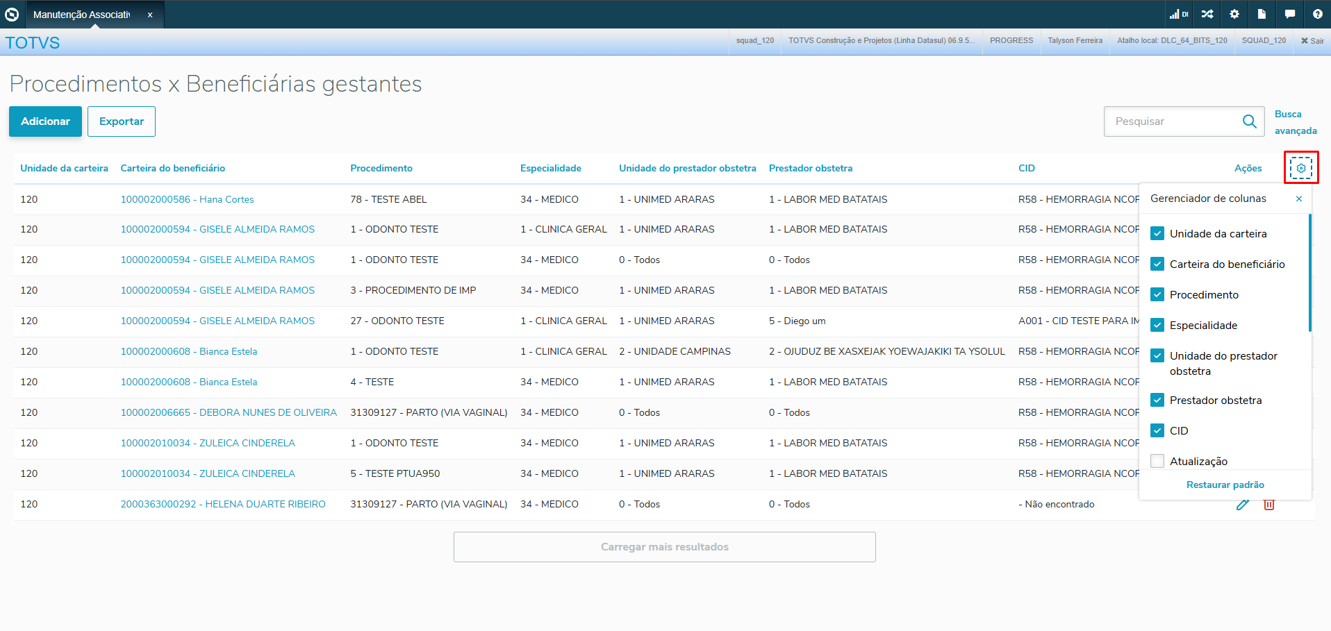 | Gerenciador de colunas | Marcar ou desmarcar as colunas conforme necessidade de exibição. |