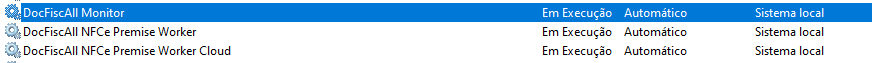 Após concluída a instalação, será possível ver os serviços do DocFiscAll sendo executados nos serviços do Windows.