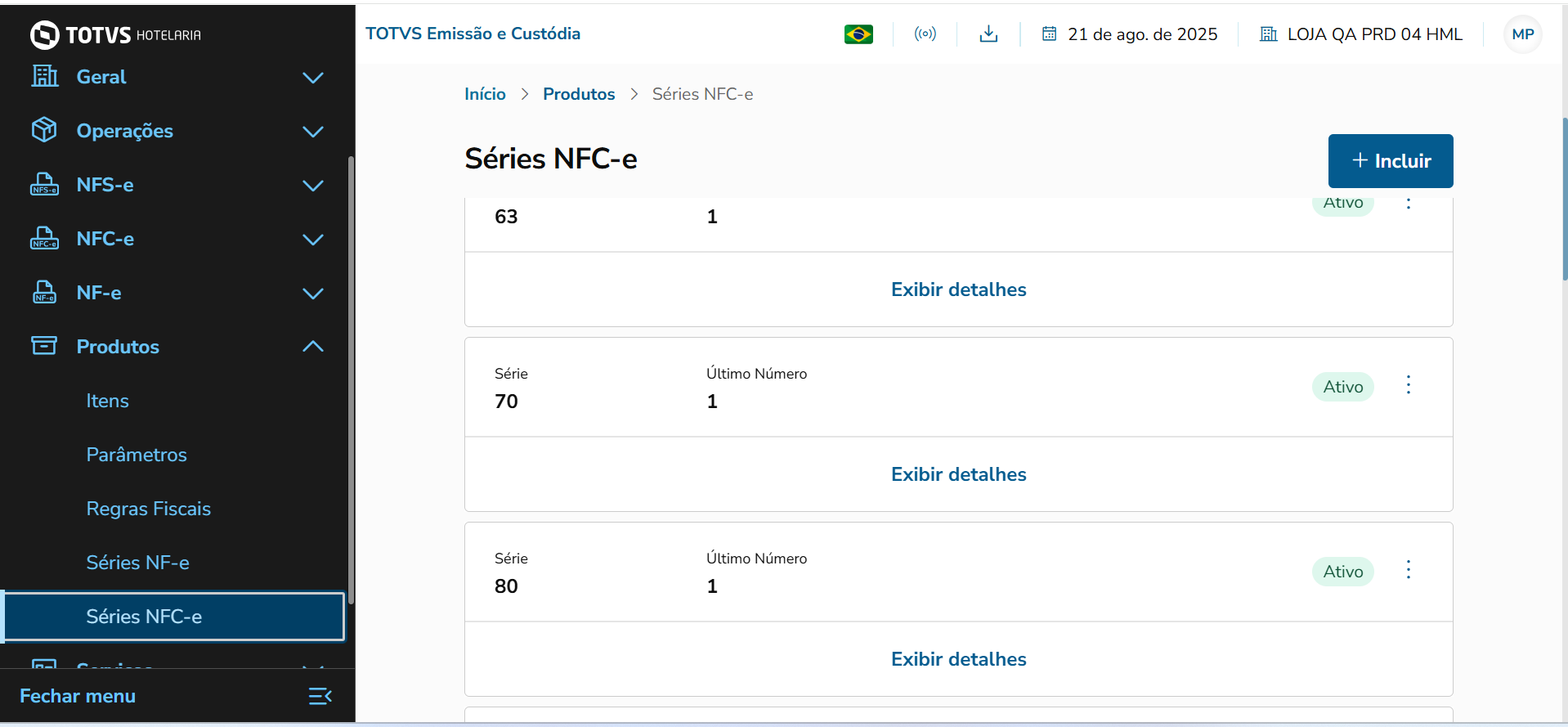 No menu lateral esquerdo, vá em Produtos > Séries NFC-e.