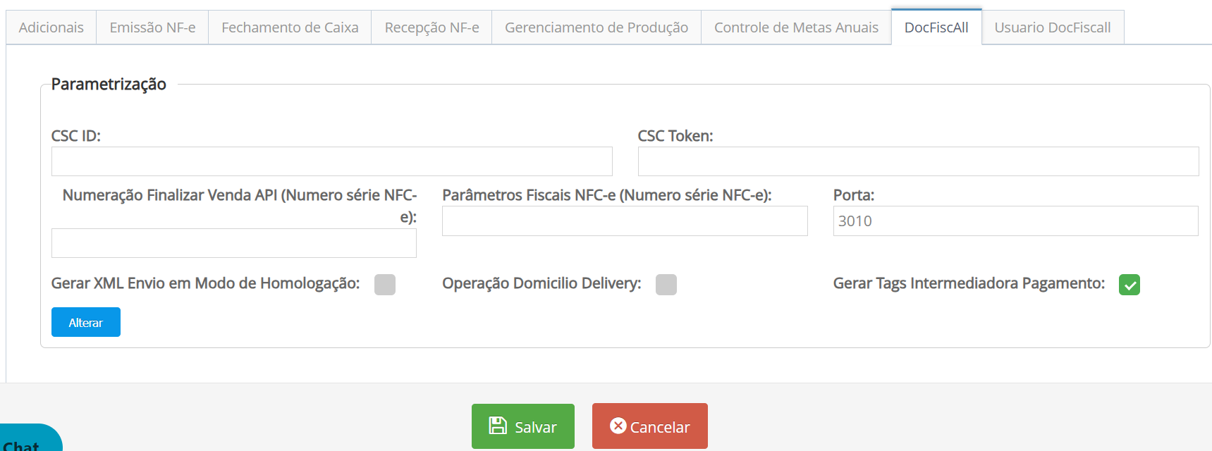 No Cadastro de lojas, na aba DOCFiscall, preencha os campos de Parametrização.